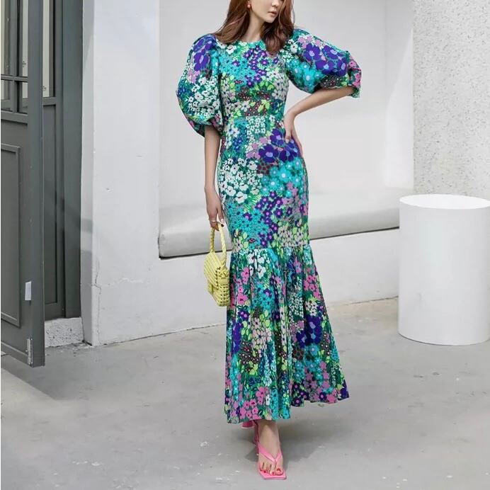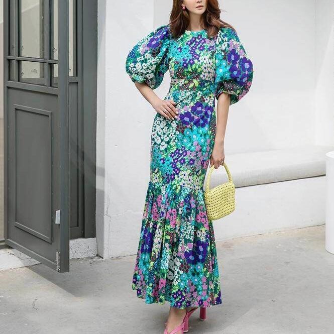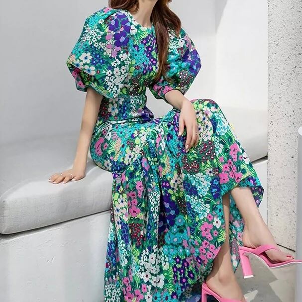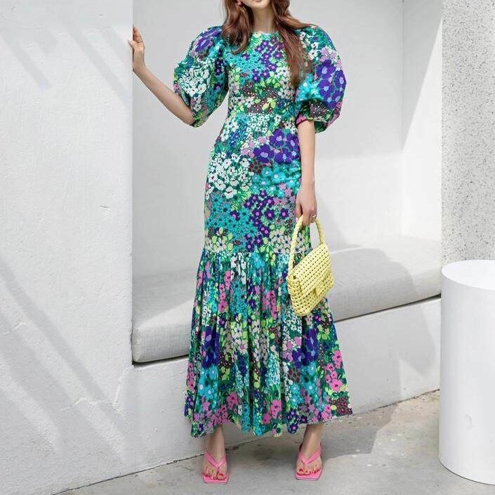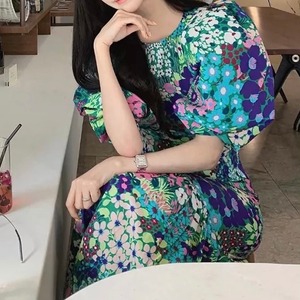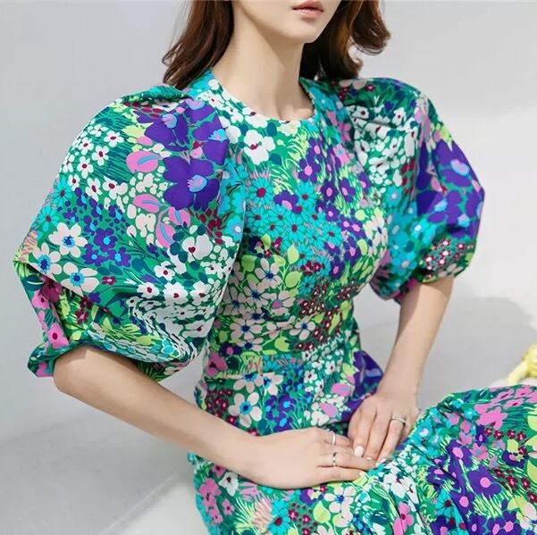 フラワープリント パフスリーブ ワンピース